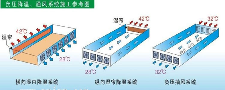 負(fù)壓(yā)風機(jī)向外排出空氣使室內氣壓下降,室內空氣變稀(xī)薄,形(xíng)成一個負壓區,空氣由於(yú)氣壓差補償流(liú)入室內。在工業廠房(fáng)實際應用中(zhōng),負壓風機集中安裝於廠房一側,進氣口於廠房房(fáng)另外一側,空氣由進氣口到負壓風機形成對流吹風。