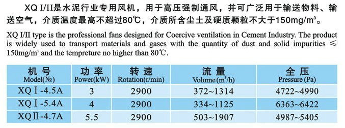 4、XQ型高壓離心(xīn)風機(也叫水泥高壓斜槽風機)圖片及參數表: