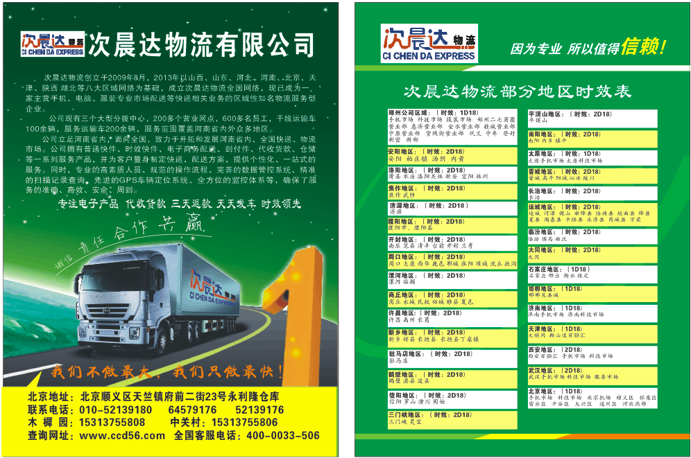 飛(fēi)翔(xiáng)捷運攜手次晨達物流(liú)進(jìn)軍卡班隊伍,河南(nán)次晨達物流有限公司創立於(yú)2009年8月(yuè),2013年以山西、山東、河北、河(hé)南、湖北、北京、天津、陝西等八大區域網絡成立次晨達物流全國網絡,現(xiàn)已成為一家主營手機、電腦、服裝(zhuāng)專業市場配送等快(kuài)遞相關業務的區域性知名物流服務型企業。