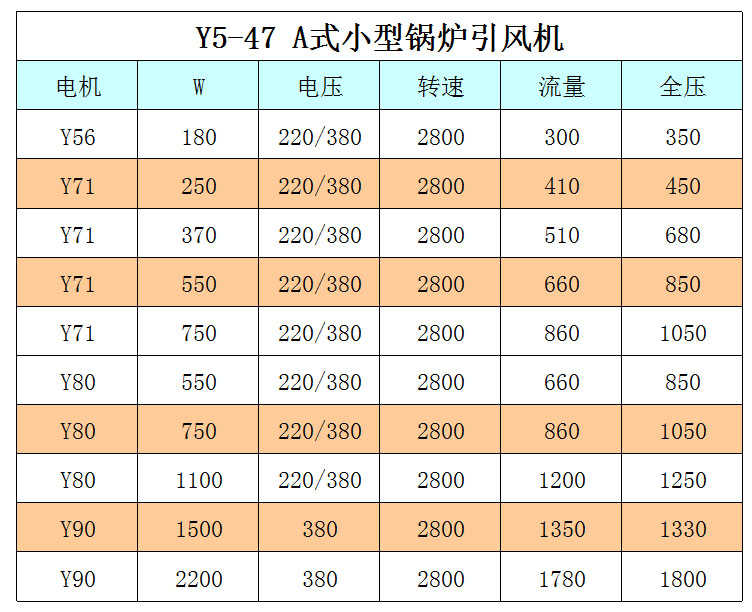 Y5-47型C、D式鍋(guō)爐引風機(離心風機)為懸臂結構、布置方便,電動機直聯(lián)傳動,均勻傳遞轉矩,減小振動(dòng)使風機運行可靠。安裝及檢修(xiū)方便,該風機有兩部完整的底座機殼(ké)及(jí)傳動組,機殼有中分麵和立分麵,拆裝特別方便,轉子可垂直吊出,如隻更換(huàn)葉輪時也可軸(zhóu)向拆裝。